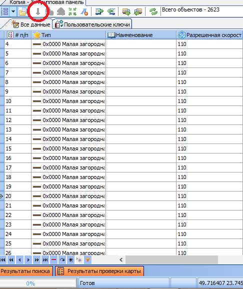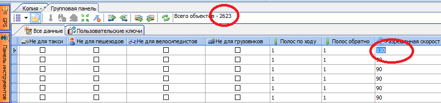 Жмем кнопку "Заполнить" - выделена красным - и через 5 секунд - видим результат. Всем 2623 объектам установилась скорость 110.